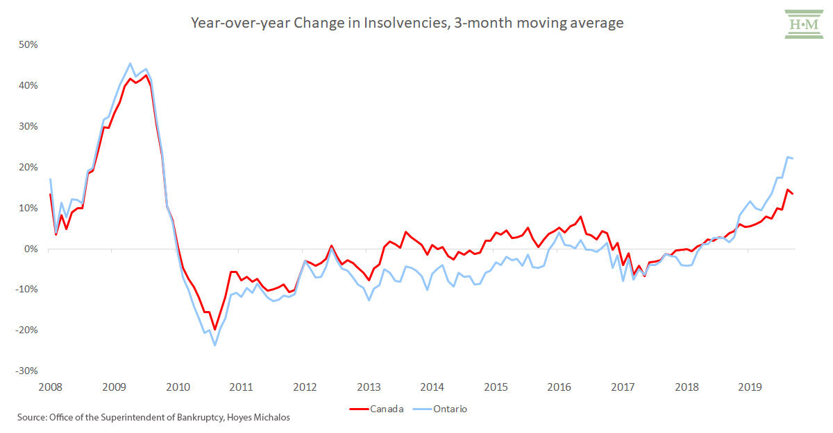 Since April 2018, the number of insolvency filings in Canada, and the rate of growth, is accelerating. Canadian insolvencies went up almost 10% in 2019, while Ontario and other provinces will be above 16%.